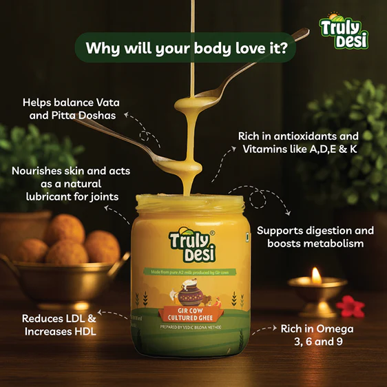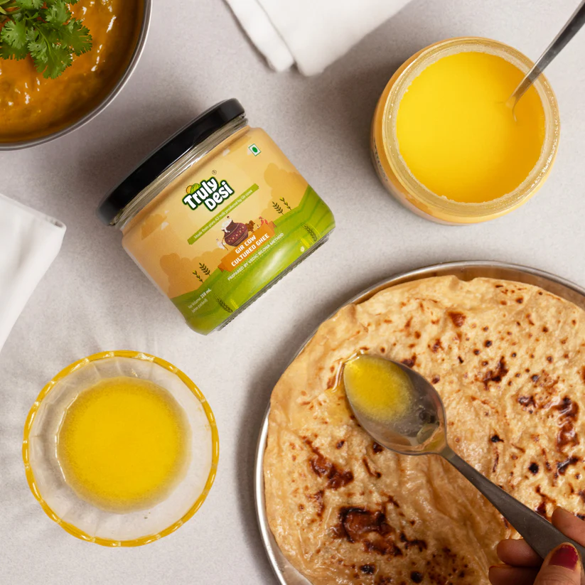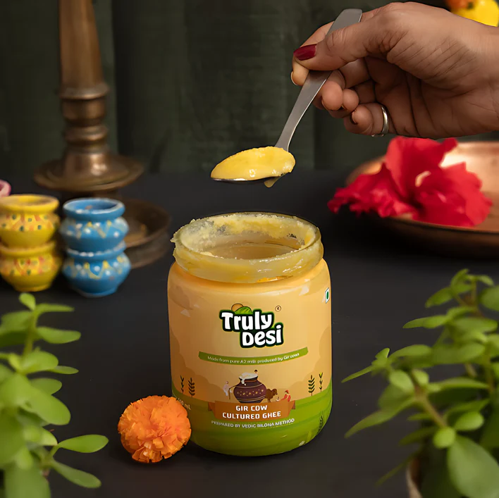 Experience the richness of authentic Indian ghee with our Gir Cow Cultured Ghee, made from A2 milk of grass-fed Gir cows using the traditional bilona method. This pure and nutrient-rich ghee enhances taste, improves digestion, and supports overall wellness. Get your Gir Cow Cultured Ghee now at Truly, your trusted source for traditional dairy products.